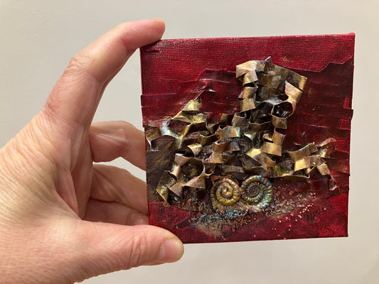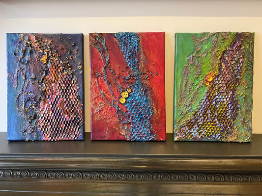 This collection was created through an intuitive process, guided by both memory and material. Each piece is inspired by places I’ve visited and the unexpected textures that emerge when different materials come together. I’ve enjoyed experimenting with fabrics like hessian and gauze, as well as paper elements such as cardboard and honeycomb wrap. These are layered and strengthened using Powertex mediums and plaster compound. I often incorporate clay to bring a sculptural quality and added depth—many of the works resemble wall-mounted sculptures, inviting both touch and reflection.